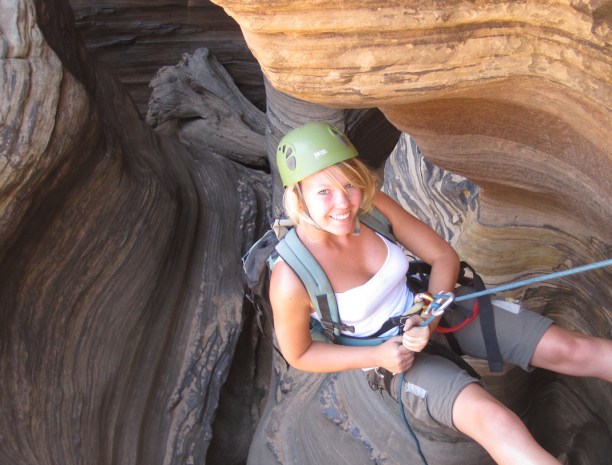 De eerste afdaling was niet zo’n groot probleem. Vooral omdat we het al een aantal keer gedaan hebben in Zweden. Ons geheugen moest wel weer een beetje opgefrist worden dus namen we de trucjes, lussen, cabines enz. samen nog een keer door. Daarna werd het al wat avontuurlijker, namelijk door het water. Vooral de derde afdaling was echt super! Het was echt een smalle spleet tussen de canyons net zoals je het altijd op foto’s ziet. Ik ging als eerste dus wist niet precies wat me te wachten stond. Toen ik helemaal beneden was riep Hank: “Okay and now throw your autoblock away!” (de autoblock is de rem). Dus natuurlijk trok ik de autoblock nietsvermoedend eraf en meteen viel ik met een vaart naar beneden in het ijskoude water! Ook het feit dat ik meteen koppie onderging maakte het alleen maar erger. Nouja, erger… Het was echt hartstikke gaaf.