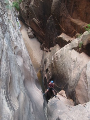 En ja, die woorden maakten het nog wel even wat spannender. Het begin leek niet veel anders als de anderen, maar dat werd al gauw anders. Op een gegeven moment ontstond er een spleet en ik (niet erg slim) zat met beide voeten aan een kant van de spleet, die steeds breder werd. Nou ben ik niet bepaald de lenigste dus dat werd algauw een probleem. De spleet was wel heel mooi en liep heel ver door de canyon in, daar heb ik nog wel even van genoten. En toen kwam toch echt het moment dat ik mijn voeten moest laten gaan. Met een klein sprongetje naar achteren maakte ik mijn voeten los van de wanden en vloog een heel stuk de spleet in. Na eventjes heen en weer gebungeld te hebben zakte ik weer verder en verder. Inmiddels had ik al wel weer een rotswand gevonden waar ik mijn voeten tegenaan kon zetten en liep verder naar beneden. Maar al snel kwam obstakel no. 2, het einde van de rotsen. Natuurlijk zit het allemaal tussen je oren, want je zit hartstikke vast aan de touwen dus er kan niks gebeuren! Maar toch was het wel griezelig om een sprongetje te maken en weer een stuk naar beneden te zakken. Ik kon inmiddels te bodem al zien. Ook hier zat een dunne spleet en aan de andere kant weer ijskoud water. Ik ging lekker op een rotsblok staan, maakte me los van de touwen en wachtte op Inge en Hank voordat ik het koude water weer zou trotseren.