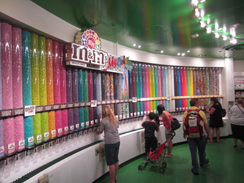 Wat een feest! Serieus overal waar je kijkt wordt je verblind door flikkerende lampen. Echt als je nog een beetje slaapt, wordt je hier wel wakker van! Allerlei verkleedde mensen lopen rond, het leek wel Disneyland! Al snel kwamen we een bekende tegen: Jack Sparrow. Voor de rest hebben we Spongebob, Spiderman, Marilyn Monroe, Star Wars figuren en Dora ook nog gespot. We wandelen de M&M store in en ik verbaas me over de hoeveelheid spullen van mijn 5 kleine vrienden. 4 verdiepingen vol met alles van m&m’s: onderbroeken, sokken, bekers, kettingen, knuffels, t-shirts, ochtendjassen en natuurlijk de m&m’s zelf. In alle kleuren en maten en zelfs smaken die wij niet hebben: peanutbutter en coconut.