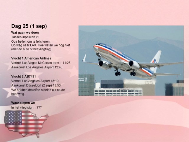 Over de rest kan ik heel kort zijn, we vliegen van LV naar LA, wachten op het volgende vliegtuig en stappen daar in voor de reis terug. Flashbacks van de vakantie vliegen voorbij en na mater we verder vliegen, hoe groter de heimwee wordt, maar de wens iedereen weer te zien stijgt enorm.