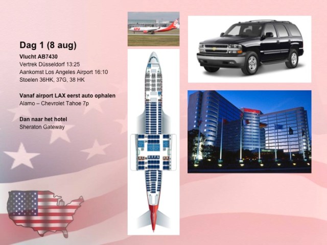 Om 8 uur ’s ochtends het bed uit en op weg naar Düsseldorf waar we om 13:30 uur eindelijk met het vliegtuig naar Amerika vertrokken. Elf uur later kwamen we aan in Los Angeles. Het viel allemaal reuze mee, de tijd vloog voorbij! Letterlijk en figuurlijk, want terwijl het voor ons gevoel eigenlijk 00:30 uur hoorde zijn, was het nog maar 16:00 uur ’s middags. Bij het auto-verhuur haalden we, tot pappa’s grote vreugde, een grote GMC Yukon op en reden we meteen naar ons hotel. Allemaal doodmoe bestelden we in het restaurantje van ons hotel 2 pizza’s en doken we om 20:30 uur (!) meteen ons bed in.