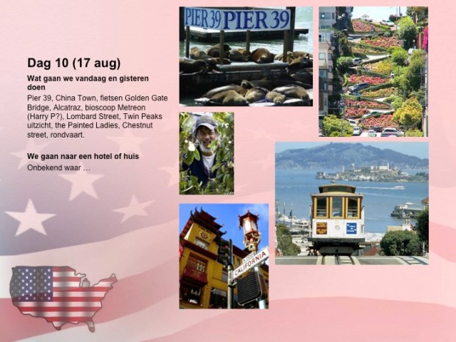 Ik heb net alles vanaf dag 4 tot hier gelezen en echt in een woord WOW! Echt gaaf dat je hebt gezwommen met dolfijnen en je vader is best wel een pestkop :P. Alcatraz lijkt mij best wel spannend eigenlijk. Ik ben benieuwd naar je andere blogs x