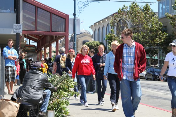 Na een heerlijk ijsje van Ben & Jerrys wandelden we naar Pier 39, en dat ging niet zonder gevaar… Op een gegeven moment zei mijn vader dat we even naar de overkant van de straat moesten en daar een stukje lopen zodat hij een foto kon maken. Ik vond dat harstikke onzin want ik bedoel, waarom per se aan die kant van de straat een foto?! Het was precies hetzelfde als aan deze kant. Toch kon ik er niet om heen en moest ik aan de overkant een stukje lopen. Inge liep al een stukje vooruit en Romée, Sophie en ik liepen nietsvermoedend achter haar aan. Ik liep het meest rechts van de groep en dus het dichtst bij de prullenbakken. Op een gegeven moment was ik pap kwijt dus heel geconcentreerd zocht ik de straat af op zoek naar hem. Totdat de planten naast mij ineens begonnen te bewegen en er een harde schreeuw vandaan kwam. Ik schrok me helemaal kapot en een eindje verderop zat mijn vader lachend met zijn fotocamera. Verbaasd en nog half geschrokken keek ik naast me en zag ik hem: The Bushman.