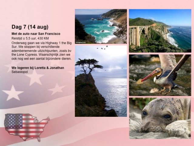 Na een nachtje in een hotel in San Simeon reden we weer verder over de Highway one, richting Sebastopol. Het was lang rijden maar dat was dit keer helemaal niet zo erg. Het was namelijk een prachtige weg. We zijn meerdere keren uitgestapt om even te genieten van het uitzicht en foto’s te maken. De restaurantjes daar waren wat minder maar ik zal jullie de details besparen… Uiteindelijk reden we door San Francisco, dat was zo gaaf! Je kon Alcatraz goed zien liggen toen we over de Golden Gate Bridge reden. Helaas moesten we gewoon doorrijden want we waren al op weg naar Sebastopol. Het was vanaf daar gelukkig nog maar een uurtje rijden. We stopten even bij een Subway en uiteindelijk waren we om half negen gearriveerd bij Loretta, de beste vriendin van Inge toen ze hier op de highschool zat. Ze heeft twee kinderen: Mateo (7) en Gabriel (4). Die verwelkomden ons met een hoop gegil en geschreeuw. Ze renden rond als gekken toen ze ons zagen en eerst wist ik niet of dat van de schrik was of van blijdschap. Gelukkig bleek het uiteindelijk van blijdschap te zijn! We waren hartstikke moe van de lange dag dus we hebben even aan tafel gekletst, de cadeautjes uitgepakt, bedden klaar gezet en we zijn gaan slapen.