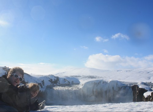 Het weer zat heel erg mee, de zon scheen prachtig en de lucht was helder blauw. Maar man oh man, wat stond er een wind! Ons eerste bezoekje was aan Godafoss en serieus, het was een heel gevecht om daar te komen. Bij wind tegen moesten we uiteindelijk kruipend over de grond en bij wind in de rug vlogen we zo wat vooruit. Geweldig! 😀
